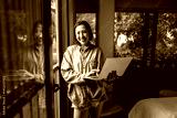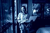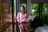 Middle eastern, asian woman working on a laptop in a tropical-inspired home office
