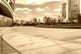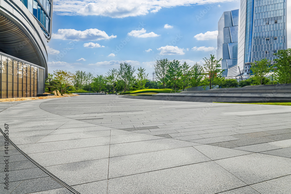 Modern city business park with empty paved plaza ground and contemporary office building exteriors background.