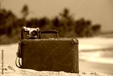 Travel vintage suitcase and camera on a beach