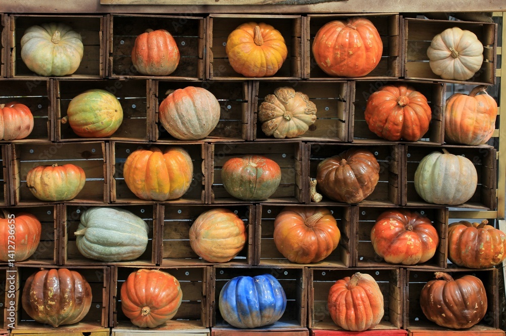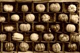 Various colored pumpkins in a wooden cabinet. There is one pumpkin in each section of the cabinet.