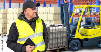 Warehouse worker in a safety vest stands near stacked boxes and a forklift, holding a tablet for inventory control. - Warehouse, Logistics.