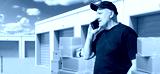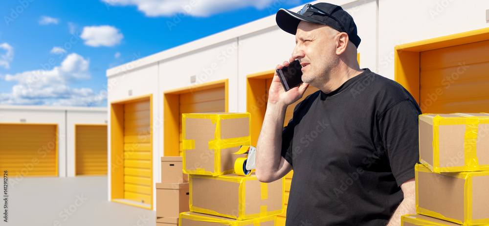 Man speaks on phone near stacked cardboard boxes at self-storage units, possibly arranging transport or access. - Storage, Logistics.