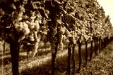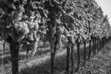 Abundant clusters of ripe white grapes hang from a vibrant vine with green leaves in a sunny vineyard