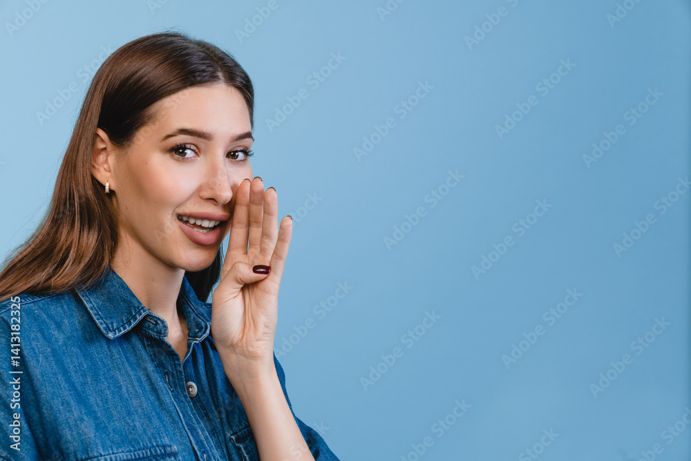 Caucasian young woman in casual denim shouting loud like in loudspeaker whispering about sale discount offer gossip tell a secret isolated in blue pastel background copy space