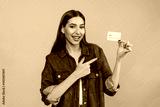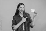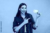 Attractive smiling girl woman female student holding in hand demonstrate pointing index finger of plastic credit bank card wearing casual denim isolated on blue color background. Banking concept