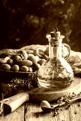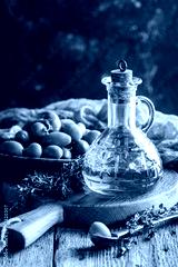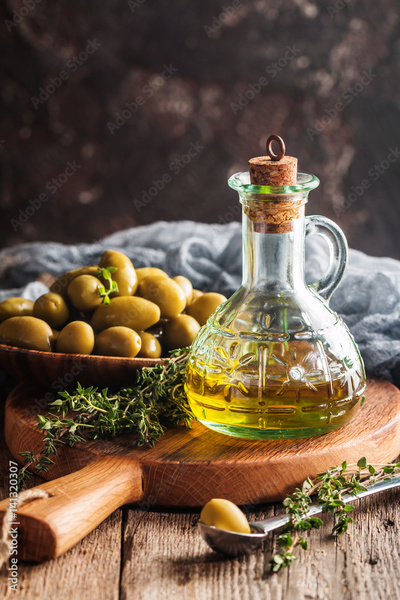 Olive oil and bowl of olives
