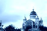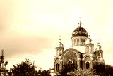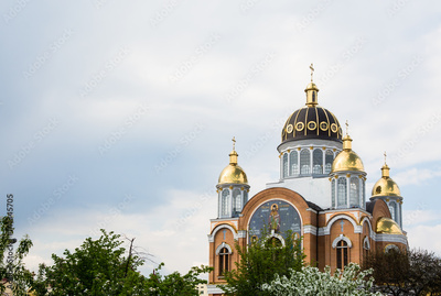 New orthodox church with golden domes in spring, build in 1990's in Kiev, the capital of Ukraine