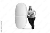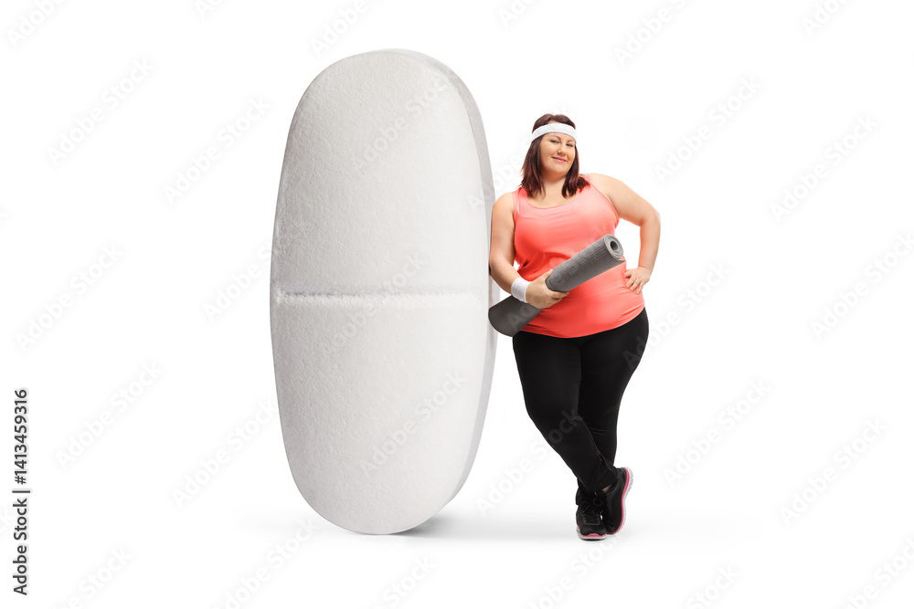 Full length portrait of an overweight woman with an exercise mat leaning on a pill