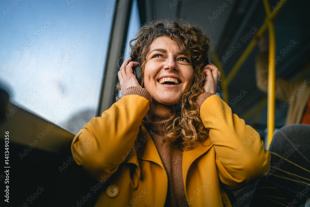Portrait of woman use public transport with headphones and smile