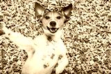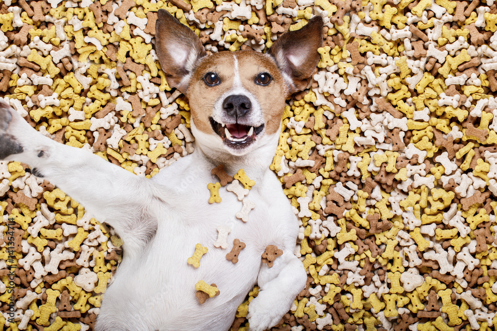 hungry dog in big food mound