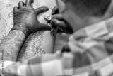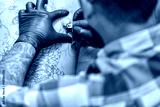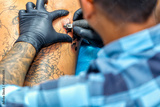 Close up tattoo artist demonstrates the process of getting black tattoo with paint. Master works in black sterile gloves.