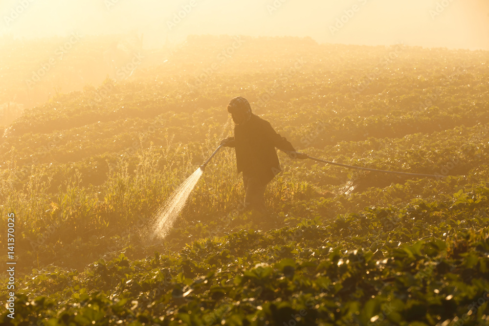 Worker harvesting strawberry in strawberry field at Doi Ang Khang Chiang Mai, Thailand