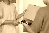 Delivery Man And Customer Doing Transaction With Giving Package While Purchasing Using EDC Machine