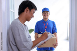 Young Asian Delivery Man Holding Package and Customer Signing On Clipboard For Delivered Parcel