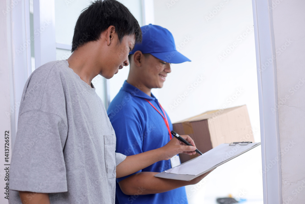 Customer Man Signature In Clipboard To Receive Package From Professional Delivery Man At Home