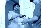 Low Angle Of Young Man Making Payment With Credit Card And Terminal Paying Courier Guy For Pizza Box