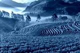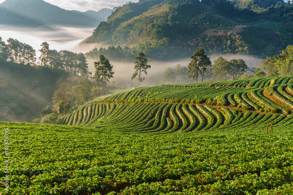 Misty morning sunrise in strawberry garden, View of Morning Mist at doi angkhang Mountain, Chiang Mai, Thailand