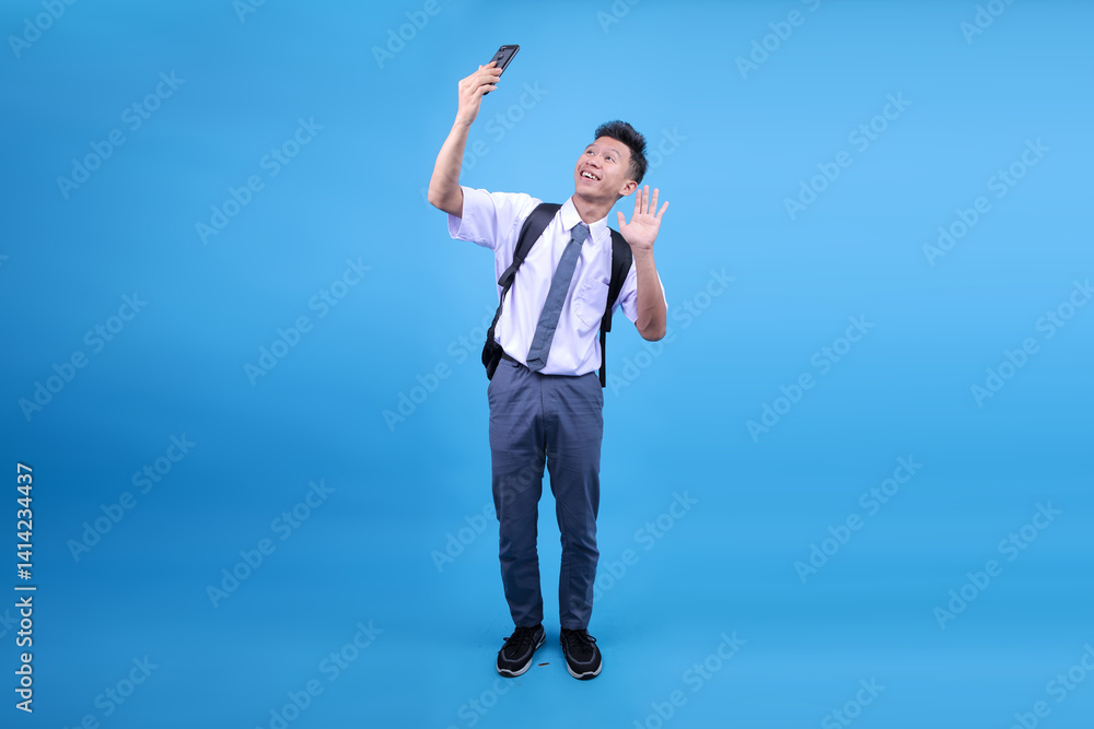 Smiling Student Guy Looking at Phone Make Video Call, Shooting Vlog or Taking Selfie