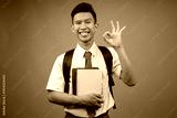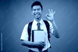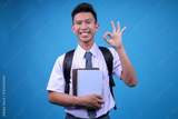 Happy Smiling High School Student Man Showing OK Sign While Holding Book Isolated On Blue Background