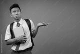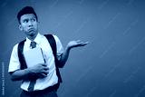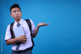 Young Asian Student Guy Shrugging Hands While Presenting With Copy Space On Blue Background