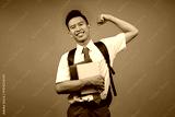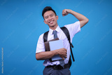 Portrait Of Indonesian High School Student Man Showing Strong Gesture On Blue Background