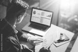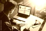 Young finance market analyst in eyeglasses working at sunny office on laptop while sitting at wooden table.Businessman analyze document in his hands.Graphs and diagramm on notebook screen.Blurred.