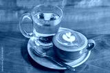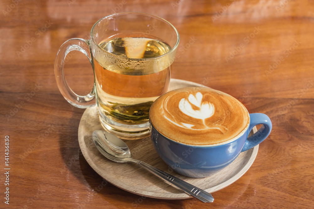 Close up coffee cup with steam on table in cafe.