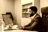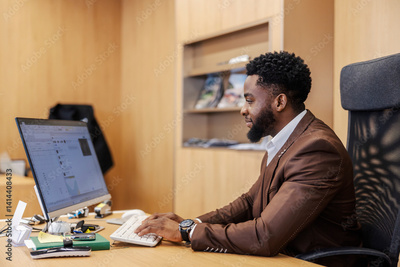 Side view of african american car seller sitting in his office and typing contract on computer.