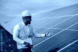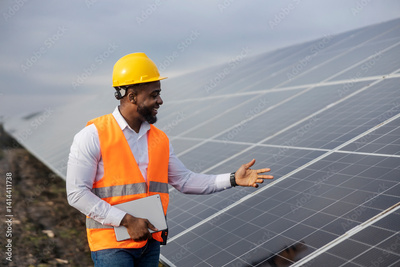 Young happy black engineer in protective work wear standing at solar farm with tablet in hands and showing at solar panels.