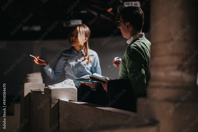 People collaborating in a museum setting, observing artifacts and taking notes, representing teamwork and historical exploration under careful lighting for an educational and professional ambiance.