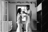 Couple dancing together in a cozy and bright living room setting