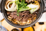 A close up of Sukiyaki meal from above, showcasing thinly sliced beef and fresh vegetables cooking in a bubbling hot pot
