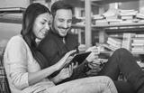 Young couple having a date in cafeteria, surrounded with books on the wooden shelves. Education, dating, relationships, lifestyle