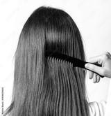 Woman with healthy brown hair with hair brush comb on white background, back view, isolation