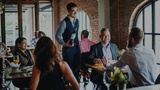 People dining in a cozy restaurant. Waiter serves wine. Diners enjoy food and conversation. Restaurant ambiance with happy diners and good service. People enjoying a meal at French bistro restaurant.