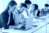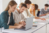 Group of young confident college or university students sitting at the same desk in the classroom during a lesson doing educational project on laptop. Education and knowledge concept.