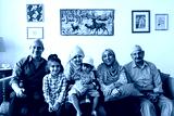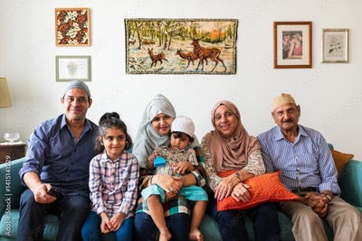 Family sitting on a couch, featuring adults and children. The family is smiling, with diverse generations. Cozy home setting with art on the walls. Happy warm muslim family photo sitting on couch.