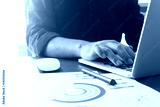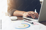 businessman hand working laptop on wooden desk in office in morning light. vintage effect