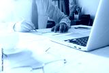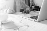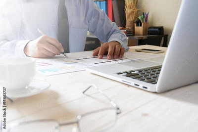 businessman hand working with laptop on wooden desk in office. can be used on an ad
