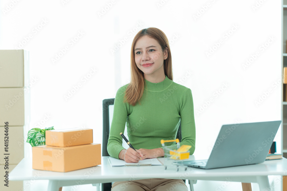 Pretty Asian woman smiling reading parcel while checking customer address on phone. Online e-commerce store, selling products, shipping.