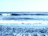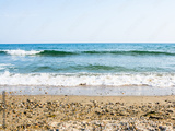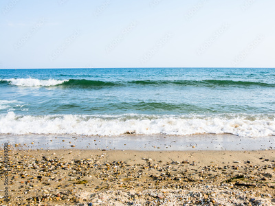 Sea tidal waves with white foam on a sunny sandy beach in resort on summer vacation. Background of ocean water texture with brown pebble (small stones) in the foreground