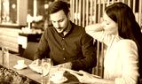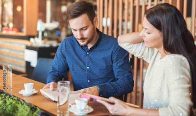 Young couple drinking coffee and reading a book in the cafe. Education, dating, relationships, love concept