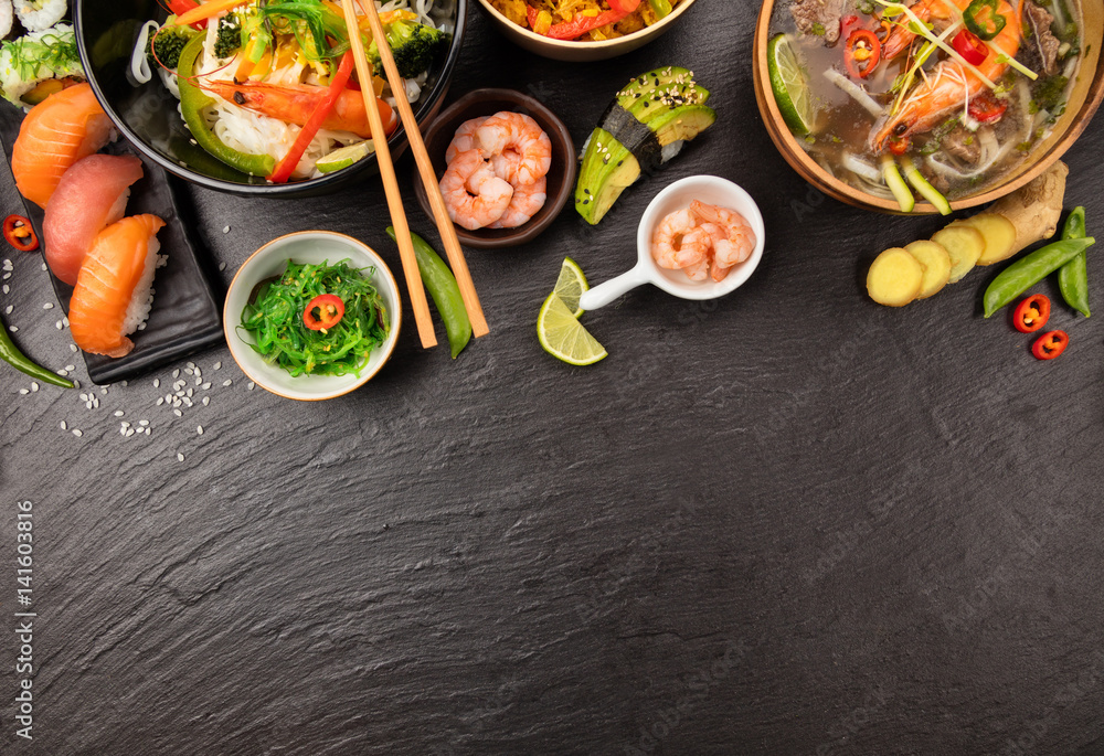 Asian food table with various kind of chinese food
