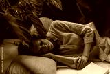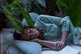 A woman peacefully sleeps on a pillow surrounded by lush green plants, creating a serene and natural environment. Her relaxed posture and calm expression reflect deep rest and connection to nature.