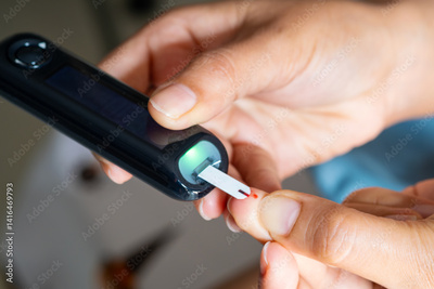 Woman's hands checking diabetes and hyperglycemia with digital blood sugar meter. Healthcare and medical concept
