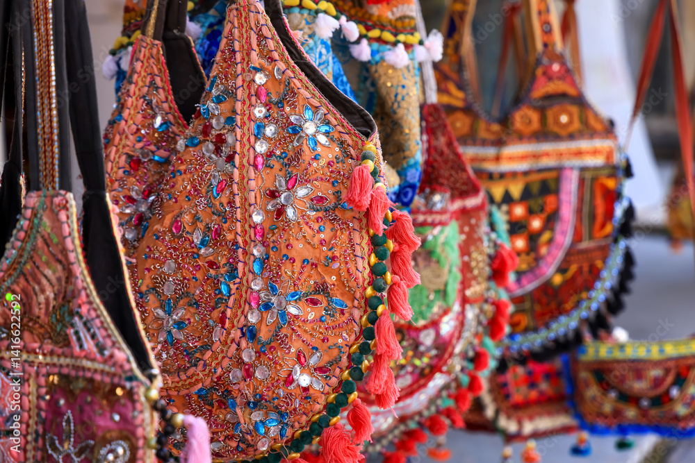 Colorful Hand made Rajasthani style womens hand bags up for sale in Udaipur, Rajasthan, India.