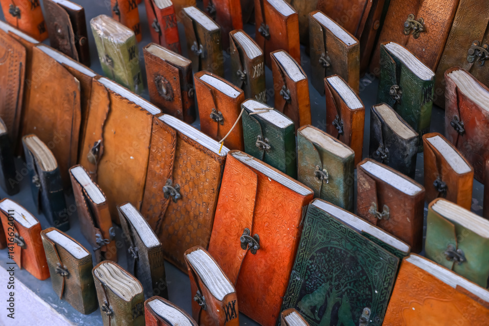 Rajasthani style vintage books up for sale in Udaipur local street markets in Rajasthan, India