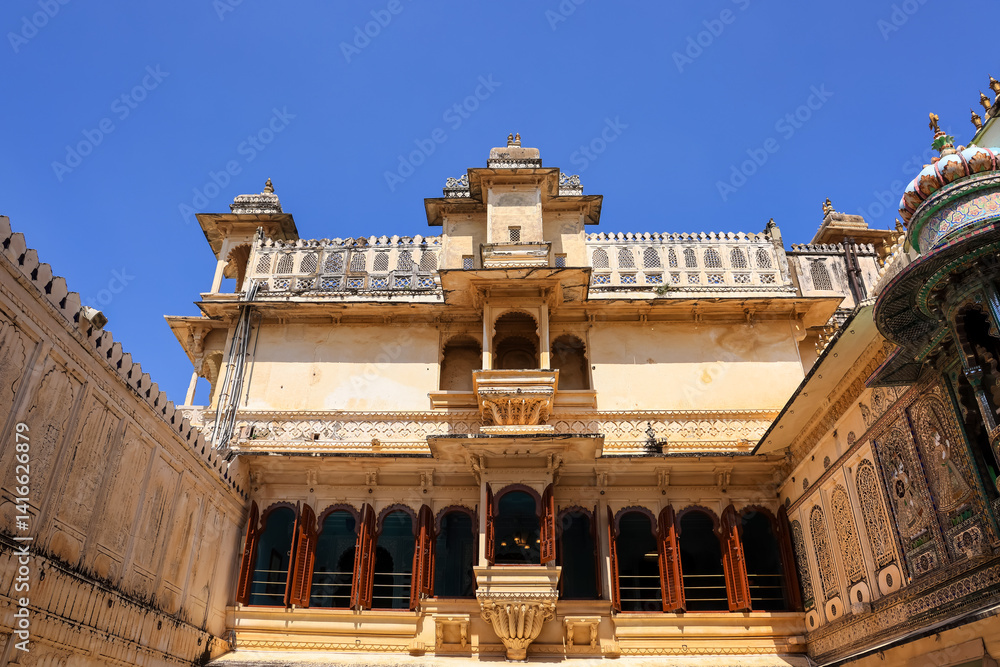 Tall walls of historic City Palace, Udaipur , Rajasthan, India.