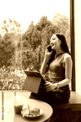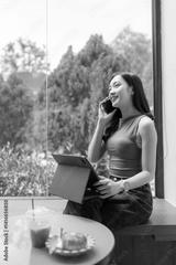 Young asian freelancer woman is multitasking, talking on her phone and using a tablet while enjoying a matcha latte and pastry in a cafe by the window, showcasing the modern work-life balance