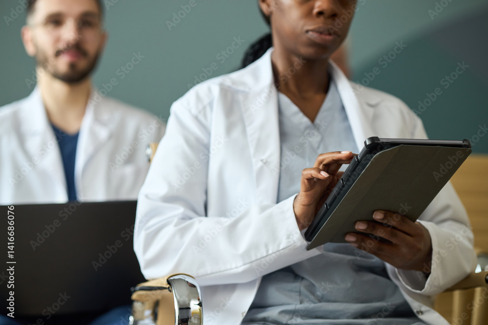 Healthcare professionals focused on data documentation during medical procedures using digital tablets, emphasizing collaborative teamwork in a clinical setting